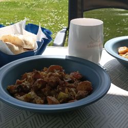 Die erste Herausforderung ließ nicht lange auf sich warten: Die Zufahrt zum Platz war... sagen wir mal, nostalgisch eng. Schon die Schranke war ein Nadelöhr, und der Weg danach glich einem Slalom zwischen Steinringen, Hecken und anderen Wohnwagen. Unser Stellplatz T2 lag am Ende eines schmalen Pfades, der eher für Fahrzeuge aus den 80ern gebaut schien. Mit einem 2,50 m breiten Wohnwagen war das Millimeterarbeit – aber wir haben’s geschafft! Endlich angekommen, Wohnwagen ausgerichtet, die Sonne schien – und wir hatten absolut keine Lust mehr zu kochen. Steffi machte sich auf den Weg zum Restaurant Klinthuus, um zu schauen, ob es noch etwas Warmes gab. Nach etwa 20 Minuten kam sie zurück – mit zwei riesigen Tellern Bauernfrühstück. Und was sollen wir sagen: Geschmacklich top, Portionen riesig, Preis-Leistung ein echtes Highlight. Wir haben’s nicht mal geschafft, alles aufzuessen. Mit vollen Mägen und einem zufriedenen Lächeln ließen wir den Abend gemütlich ausklingen.